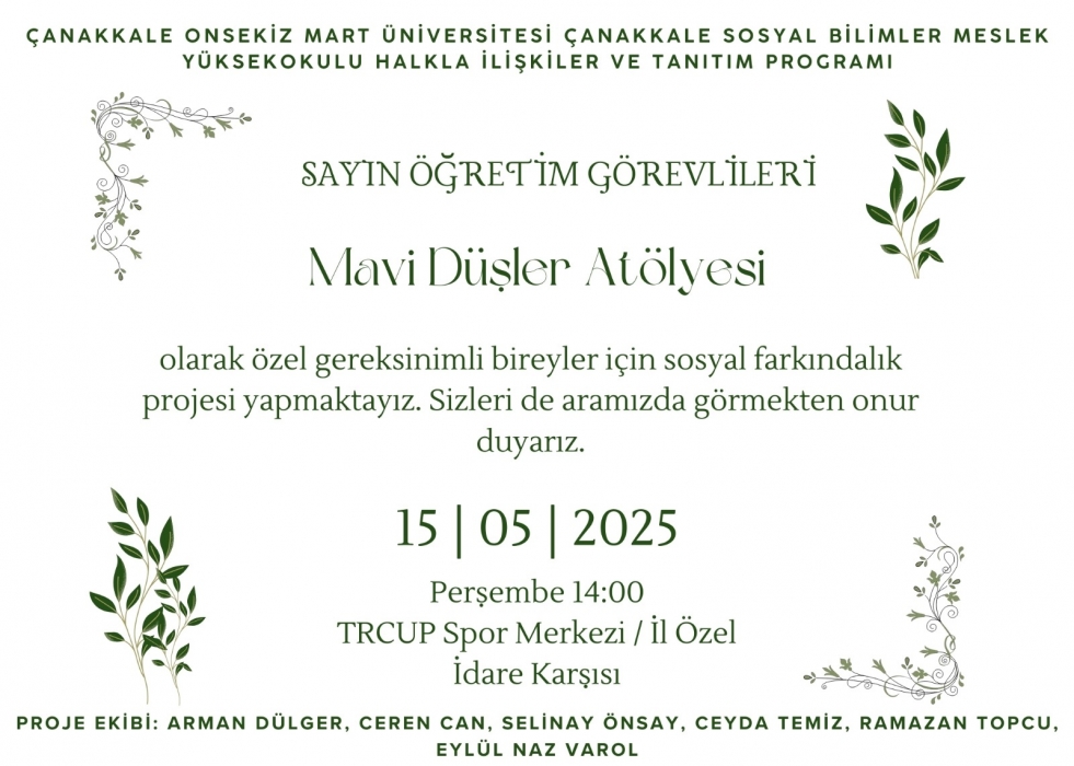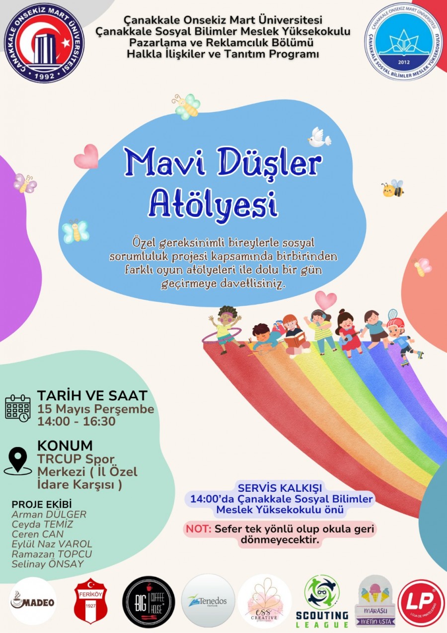 Çağkent Özel Eğitim ve Rehabilitasyon Merkezi proje ortaklığıyla, halkla ilişkiler öğrencilerinin; tüm organizasyonu kendilerinin planlayıp, uyguladığı Mavi Düşler Atölyesi sosyal sorumluluk projesi; Scouting League, Tenedos Turizm, Big Coffee House, Feriköy Pilavcısı, Madeo, Ess Creative, Maraşlı Metin Usta, Köprübaşı Pastanesi ve Loja de Prateleira’nın sponsorluğuyla gerçekleştirildi. Sosyal sorumluluk projesi dersi kapsamında Öğr. Gör. Onur Bayram ve Öğr. Gör. Seçil Düztepe Yıldırım’ın yürütücülüğünde gerçekleştirilen projeye, ders sorumlusu öğretim elemanları ile birlikte Öğr. Gör. Muhammet Haksever, Çağkent Rehabilitasyon Merkezi Temsilcisi Sedef Kaytaş, Otizm Derneği Başkanı Sevimay Çanlıoğlu ve sponsorlar katıldı.
